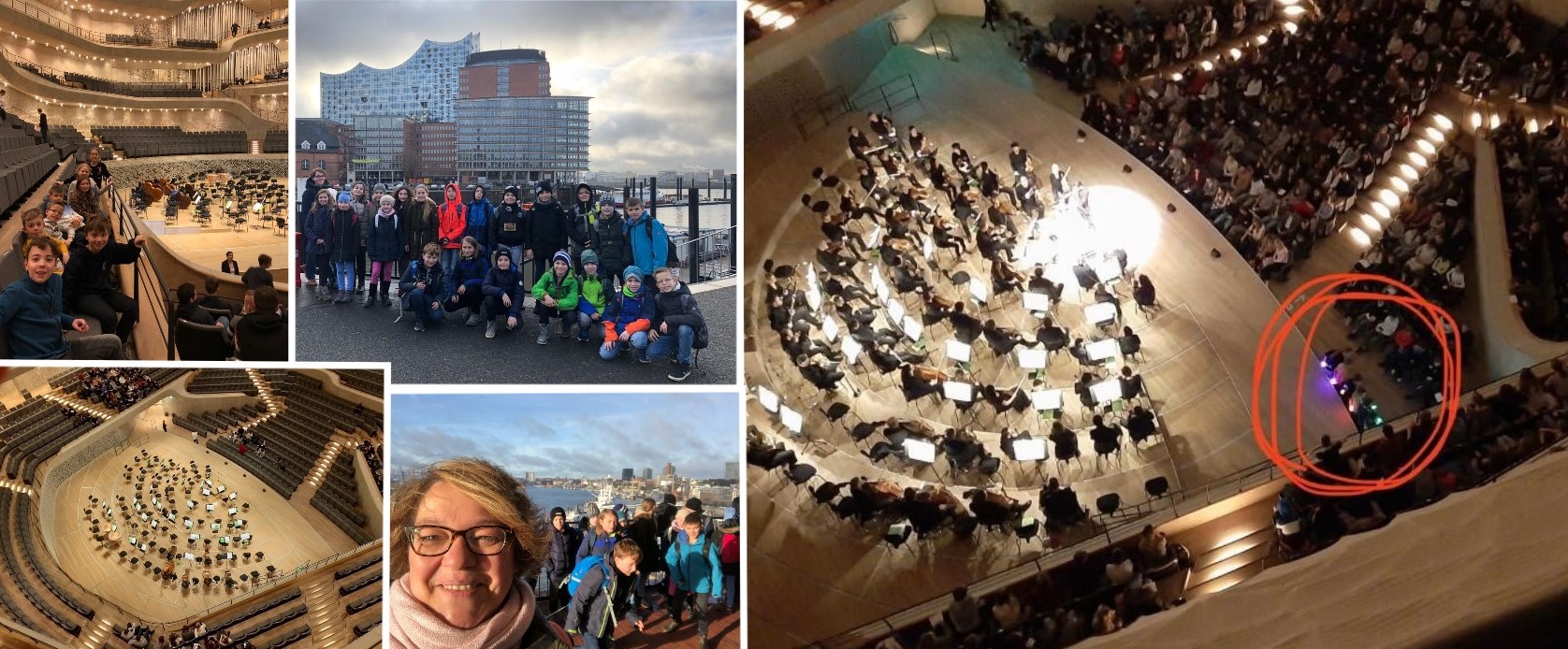 Ein besonderer Ausflug stand am 22.1. für die Klasse 4 auf dem Programm: ein Konzertbesuch in der Elbphilharmonie. Es hieß „Konzert statt Schule“, und im Beethoven-Jahr stand natürlich Musik vom großen Meister selbst auf dem Programm. Gut vorbereitet reiste die Klasse 4 mit Klassenlehrerin Frau Kirstein und Musiklehrerin Frau Weinhold an. Ein erstes Highlight war die Fahrt mit der U-Bahn zum Baumwall. Große Freude, als die vermeintliche Untergrundbahn plötzlich ans Tageslicht fuhr und den herrlichen Blick auf den Hamburger Hafen freigab. Bei traumhaften Wetter ging es zunächst auf die Plaza, um den Rundumblick zu genießen. Allein die riesige Rolltreppe war schon die Reise wert. Doch es kam noch besser. Unsere Klasse wurde in 2 Gruppen geteilt, einige Kinder saßen mit Frau Kirstein ganz oben, eine Gruppe mit Frau Weinhold ganz nah an der Bühne. Alle Plätze boten einen tollen Ausblick. Und dann passierte es: die Leiterin der Konzertreihe, Frau Dean, kam zur Gruppe von Frau Weinhold und fragte, ob die Kinder mitwirken wollten. Keine Frage! Nach einer kurzen Einweisung ging es dann im 2. Satz der 7. Symphonie los: die Kids mussten (vor ca. 1800 Besuchern) ganz nach vorn zum Bühnenrand gehen und haben dann mit leuchtenden Bällen eine Licht-Choreographie unter Anleitung von Frau Dean aufgeführt, während das Elbphilharmonie-Orchester spielte. Alle, einschließlich der Lehrerin, waren sehr aufgeregt, aber die Kinder haben ihre Sache großartig gemacht. Der Applaus war groß. Wie im Flug ging das Konzert vorbei. Danach ein kleiner Stadtrundgang mit ein wenig Geschichte und einigen versteckten Ecken, ein kurzer Stopp auf dem Rathausmarkt und dann endlich – ein bisschen Freizeit und Shopping in der Europapassage. Pünktlich um 17.30 Uhr waren alle wohlbehalten und erschöpft wieder in Travemünde. Ein wunderschöner Tag in der schönsten Stadt!