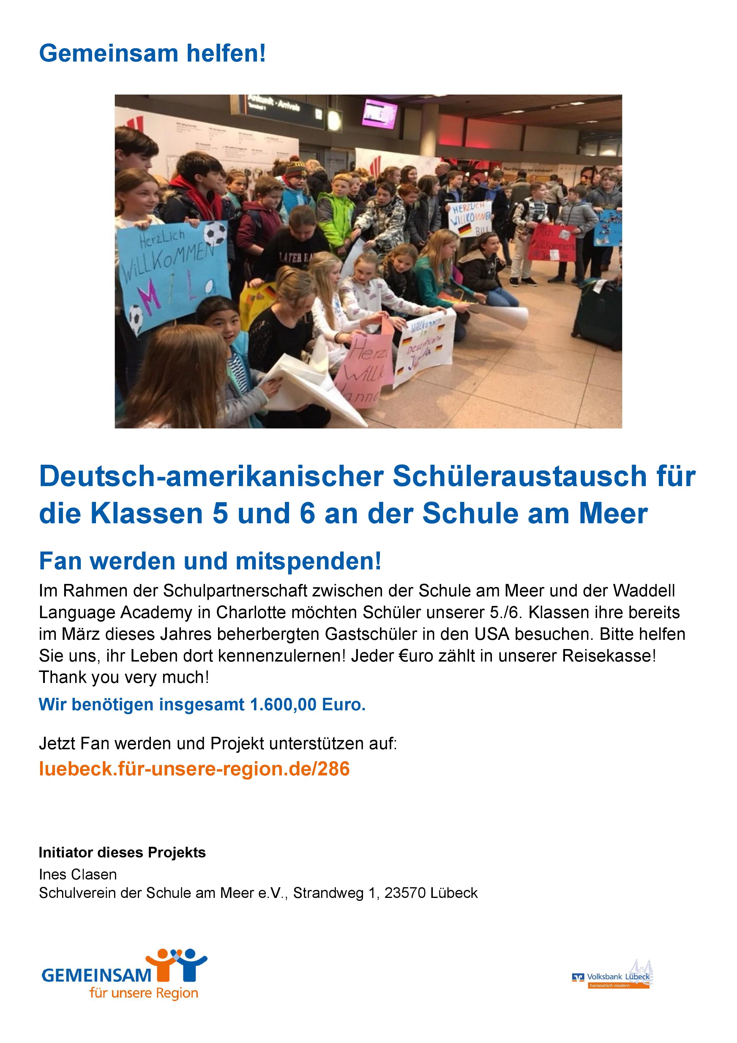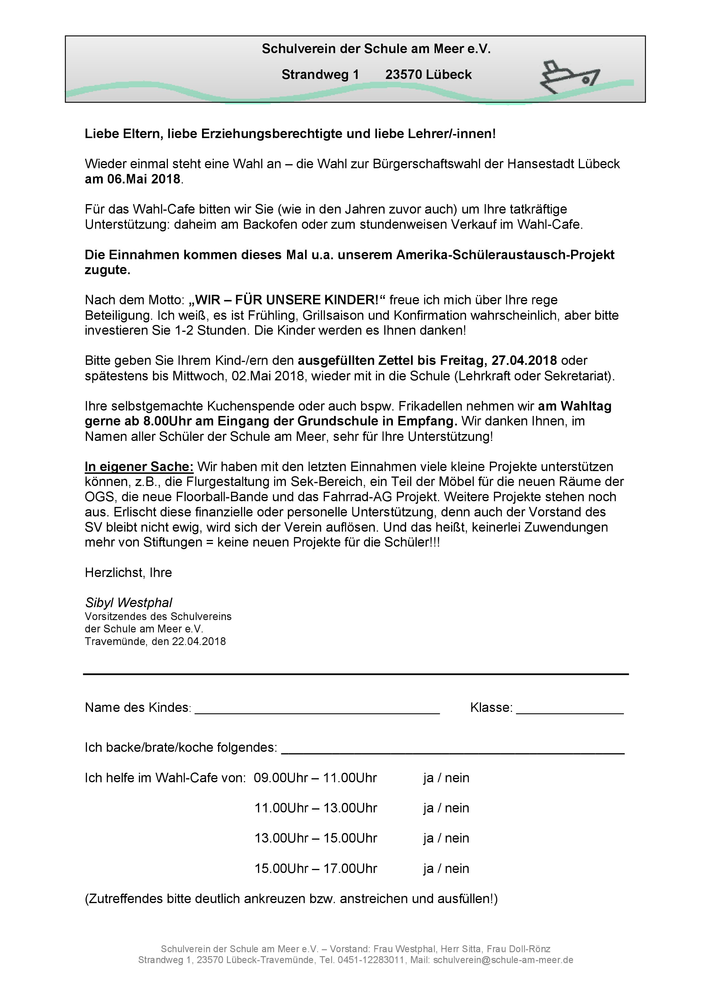 "Im Namen des Vorstandes des Schulvereins der Schule am Meer möchte ich mich ganz herzlich bei den zahlreichen Kuchen-Spenden-Gebern, bei der OGS und den Helfern im Verkauf bestehend aus Lehrern, Eltern sowie Schülern, bedanken! Es war wieder einmal - gemeinsam -, ein riesen Erfolg! Einnahmen = 700,00€!!! Da wir das Wahlcafe unter das Motto: "Wir unterstützen das deutsch-amerikanische Schüleraustauschprogramm der Klassen 5./6. " gestellt haben, freuen wir uns, 450,00€ dafür zur Verfügung zu stellen. Ferner werden wir den Rest von 250,00€ nehmen, um bspw. damit den Schulausflug aller Klassen zu unterstützen."