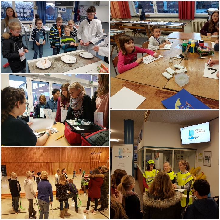 Wir blicken zurück auf einen gut besuchten Infoabend am Donnerstag für interessierte Eltern und SchülerInnen, die unsere Schule ab Klasse 5 ggfls. besuchen wollen. Viele Schülerinnen und Schüler aus den Klassenstufen 6-10 trugen zu einem gelungenen Abend bei: Die Schulsanitäter, die Green Kids, die Schülerlotsen erzählten den Kleinen, die mit einer Laufkarte ausgestattet und von großen Schülern begleitet die verschieden Stationen unserer Schule durchliefen, von ihren Aktivitäten. Im NaWi Raum wurde experimentiert, im Kunstraum oder am Smartboard wurde zum Mitmachen angeregt, in der Halle Floorball gespielt und ein Sportparcours durchlaufen und die Mitglieder der Englisch AG und Teilnehmer des Amerikaaustausches luden zum Cup Song ein. Endstation war dann der Waffelstand. Unsere Schulvereinsvorsitzende Frau Westphal informierte über den Verein und versorgte mit ihrem Sohn Eltern mit Kaffee und Getränken. Die Mitglieder des Kollegiums standen den Eltern in der Mensa oder den Fachräumen bei Fragen zur Verfügung. Jetzt wird diskutiert, wie wir die vielen engagierten SchülerInnen beim nächsten Mal noch stärker in die Gestaltung des Infoabends einbinden können; denn sie sind die authentischsten Botschafter unserer kleinen aber feinen Schule.
