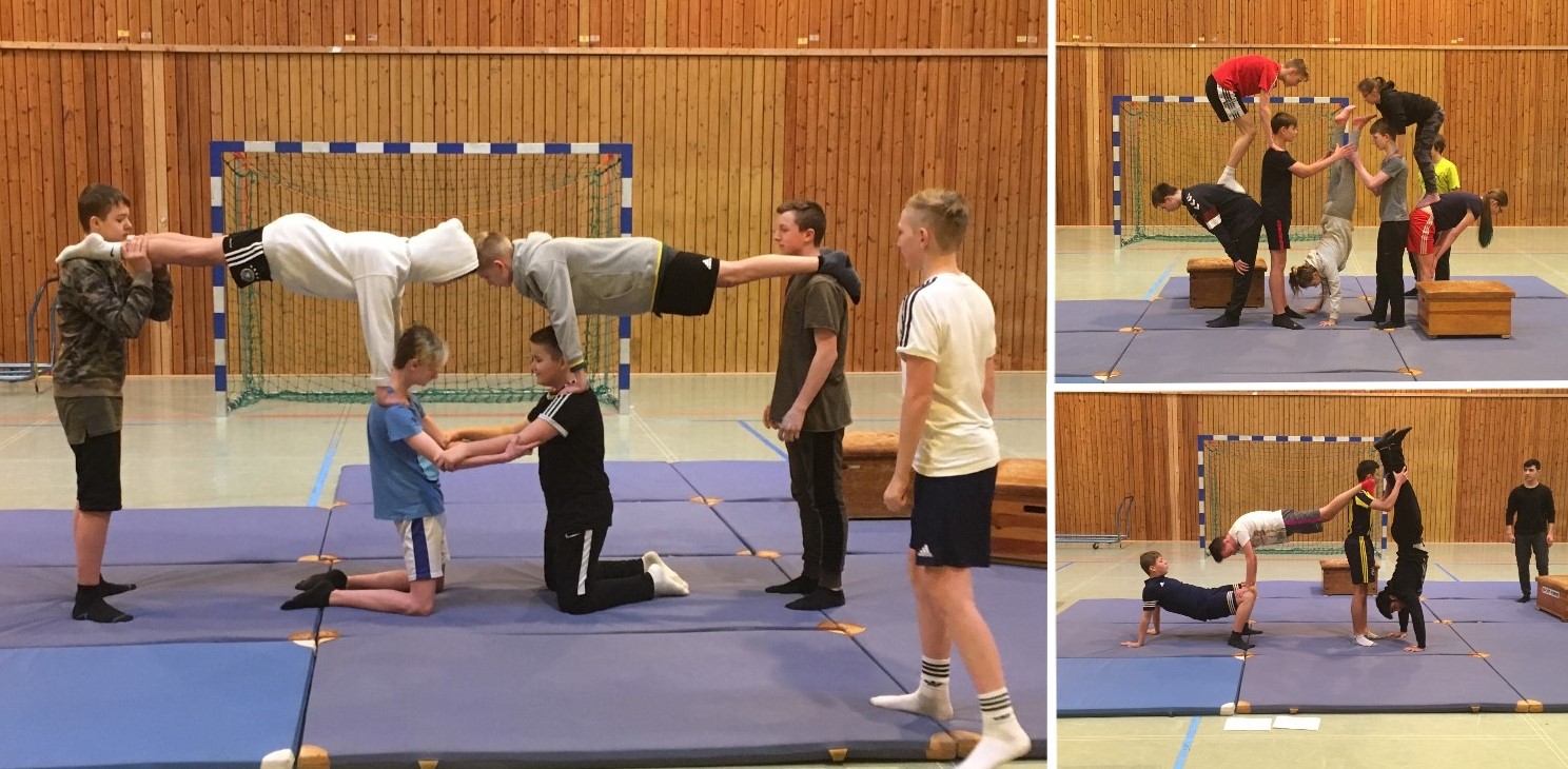 Im Rahmen des WPU Sport hat sich der 7. Jahrgang intensiv mit dem Bewegungsfeld Akrobatik auseinandergesetzt und sich diesem theoretisch aber vor allem auch praktisch genähert. Hierzu haben die Schülerinnen und Schüler zunächst die akrobatischen Grundlagen erlernt, bevor sie in Gruppen eigene Choreografien entwickelt haben. Schnell merkten die Jugendlichen, dass diese Art von Bewegung eine große Herausforderung darstellt. Dennoch (oder gerade deswegen?) waren sie mit viel Begeisterung bei der Sache und sind über sich hinausgewachsen. In einigen von ihnen konnten wir ungeahnte Talent entdecken…