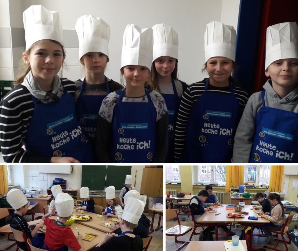 Am 12.03.2018 nahm die Klasse 4 der Schule am Meer an der Aktion "Besser essen - mehr bewegen" teil. Der Tag startete mit einem gesunden Frühstück. Dabei stellten sich die Kinder bunte Spieße aus Gurke, Paprika, Tomate, Käse und kleinen, mit Frischkäse bestrichenen Vollkornbrotscheiben zusammen. Viele Kinder waren ganz wagemutig und testeten Gemüse, das sie sonst eher verschmähen.