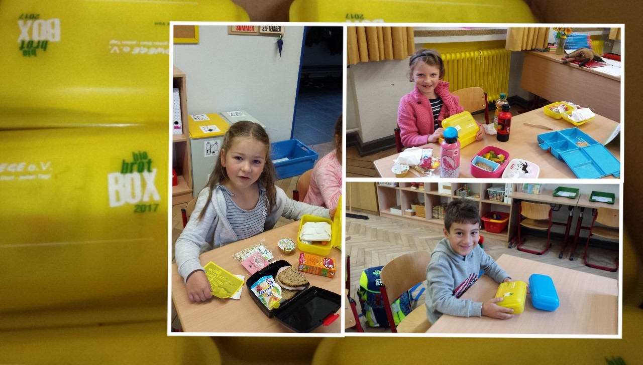 Heute haben unsere Erstklässler ein doppeltes Frühstück gehabt, denn zusätzlich zu ihrem von zu Hause mitgebrachten Frühstück, haben sie die reichlich gefüllten Bio-Brotboxen erhalten. Von der Karotte über den Fruchtsaft bis hin zum Fruchtriegel war alles dabei. Also konnte ordentlich gesund geschlemmt werden.