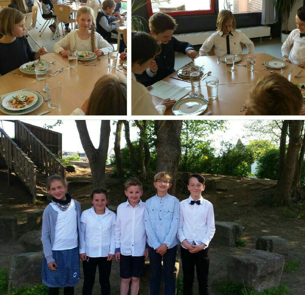 Zum ersten Mal fand für unsere GrundschülerInnen (Klasse 4) am Montag das Knigge-Training statt. Zu diesem Anlass kamen alle Kinder festlich gekleidet, ganz gespannt und mit ein wenig Aufregung zur Schule. Sie lernten unter anderem, wie man sich richtig begrüßt, welches Verhalten im Kino oder in der Bahn angemessen ist und erfuhren viel über die Tischkultur. In der großen Pause wurde mir Vorsicht gespielt, um die feierliche Kleidung zum großen gemeinsamen Essen nicht zu beschmutzen. Hier konnten alle beweisen, was sie am Vormittag gelernt haben und setzten es mit Geschick um. Im Anschluss erhielten die SchülerInnen ein Zertifikat für die Teilnahme am Seminar. Wir danken unseren Referenten von der Deutschen Bank für den tollen Tag und freuen uns auf ein Wiedersehen im nächsten Schuljahr.